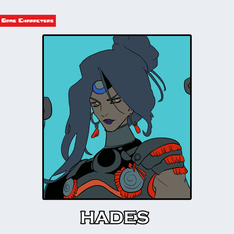 『HADES』に登場するネメシスは、灰青色の肌と鋭い眼差しを持つ人物型キャラクターである。髪は長く束ねられ、額には青い円形の装飾がつけられている。肩部には赤と黒を基調とした鎧状のパーツがあり、全体的に戦士的かつ儀礼的な構造を形成している。衣装の対称性と金属的装飾が強調され、「儀礼戦士構造」に分類される。冥界系キャラクター群の中でも特に秩序と報復を象徴する造形配置が見られる。