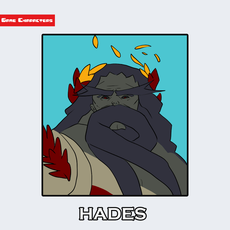 『HADES』に登場するハデスは、黒灰色の肌と長い髭を持つ壮年の神格キャラクターである。頭部には燃え上がるような赤と橙の王冠状装飾があり、肩には炎を模した赤い意匠が施されている。衣装は黒と灰の重厚な配色で、胸部には金属装飾を備えた鎧状構造が確認できる。全体として「冥界支配神構造」に分類され、同作の神々(例:ゼウスやポセイドン)と比較しても、より重力的かつ象徴的な造形を持つ。
