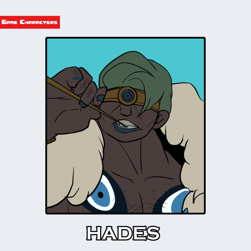 『HADES』に登場するポリフェムスは、一つ目を持つ巨人型キャラクターである。頭部の中央に単眼が配置され、右手に槍状の武器を握っている。髪は淡い緑色で短く整えられ、肩には白い毛皮のような装飾が掛かっている。体格は非常にたくましく、胸部や腕には金属の装飾が見られる。全体として「単眼巨人構造」に分類され、同作内の人型キャラクターとは異なり、原始的で物質的なデザインバランスが取られている。