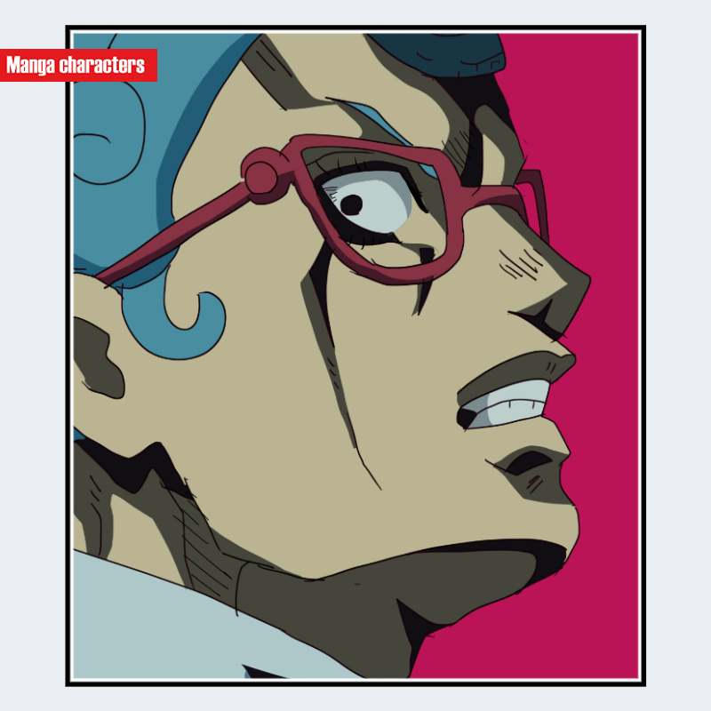 『ジョジョの奇妙な冒険』に登場するギアッチョは、特徴的な湾曲ラインを持つ赤縁眼鏡と、それに合わせて配置された涙型の装飾パーツが顔周りの識別構造を形成している。髪型は頭部前面に密着した短髪で、額から側頭部にかけて直線的な面が強調される。口元は鋭く開きやすい形状で、顎の稜線が強く描かれているのも視認的特徴となる。上半身の衣装は画像範囲外だが、首周りのタイトなシルエットが確認でき、顔面装飾との対比でキャラクターの輪郭が明確に分離する構造になっている。