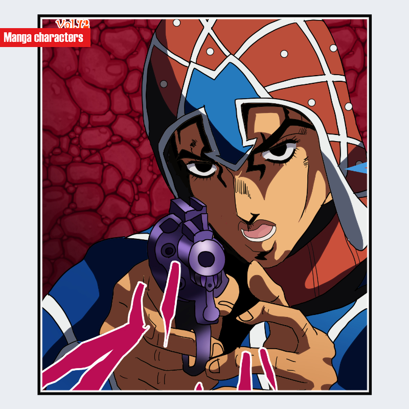 『ジョジョの奇妙な冒険』に登場するグイード・ミスタは、額から頬にかけて開口部を持つ特徴的なニット系ヘッドギアを装着し、編み目パターンが頭部全体に均一配置されている点が視覚的基盤となる。眉周辺は強めの濃淡で縁取られ、眼の陰影が深く落ちる構造を持つ。上半身はタイトな衣装で肩から腕にかけて一体化したラインを形成しており、右手には大型の回転式拳銃が前方へ突き出され、金属パーツの丸みと直線の対比が顕著。指先は長くしなり、武器のフォルムを際立たせる配置となっている。