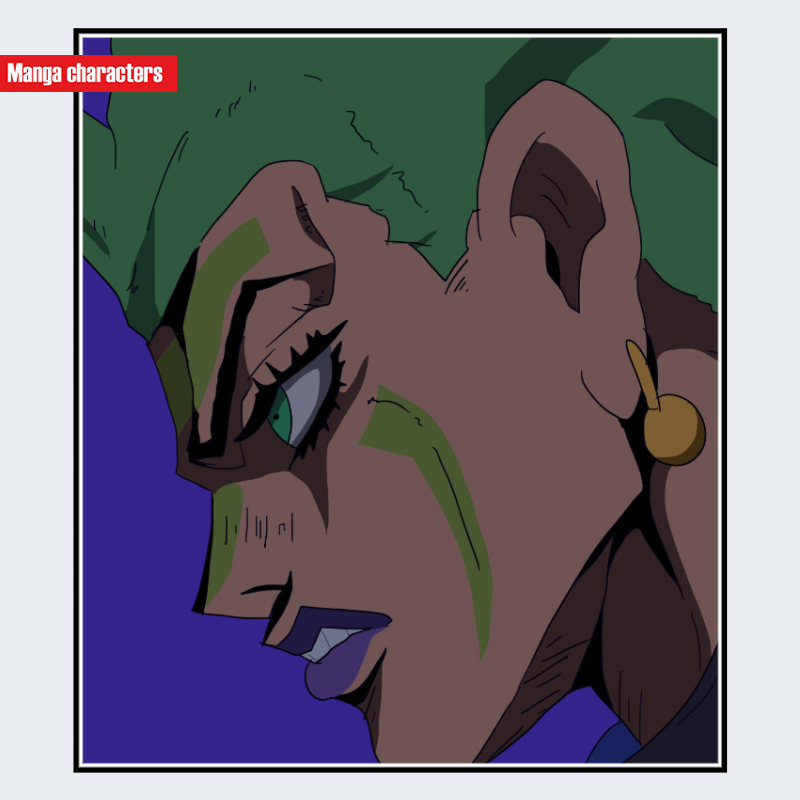 『ジョジョの奇妙な冒険』に登場するチョコラータは、濃緑色で大きく波打つ髪が頭部全体を覆う独特の髪型を持ち、前髪・側面ともに角張った塊として造形されている。顔面には同系色の帯状マーキングが複数走り、頬から額にかけて斜めに配置される点がこのキャラの視覚的識別点となる。耳は大きめに描かれ、細い金色のピアスが装着されている。まつ毛は太く鋭く外側へ跳ね、目元の影が強調される構造で、輪郭線は深い陰影により分割されている。