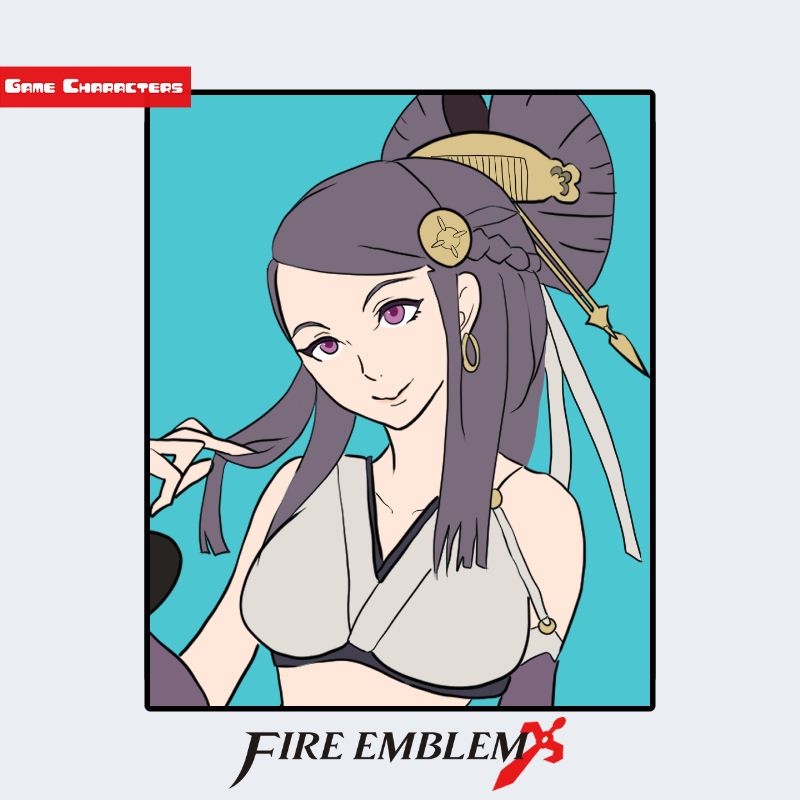 『ファイアーエムブレムif』に登場するオロチは、紫がかった髪を片側でまとめ、簪や金属製の飾りをあしらった髪飾りを着用しているキャラクターである。衣装は淡い灰色と濃紫の対比を基調とし、肩や胸元の露出を抑えながらも流れる布地の動きが強調されている。背面に垂れる装飾紐や飾り具が儀礼的印象を与え、「巫女戦装型」構造に分類される。全体として布地の重なりと装飾金具の配置が均衡しており、同作の武家系キャラとは異なる文化的造形を持つ。