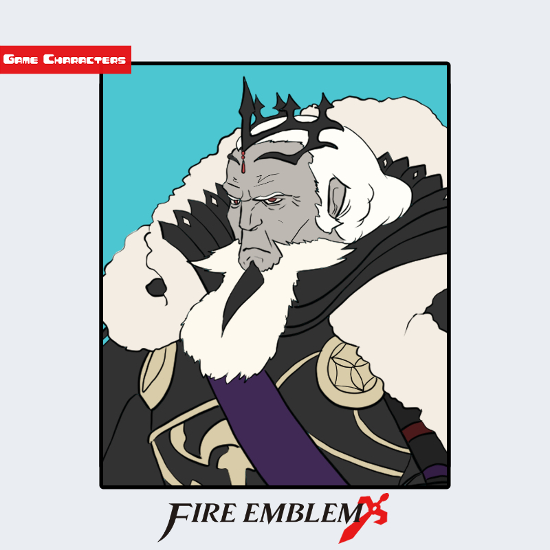 『ファイアーエムブレムif』に登場するガロンは、白髪と黒髪が交錯する重厚な髪型と、威厳を示す長い髭を特徴とする壮年男性のキャラクターである。上半身には黒と金を基調とした厚い鎧を着用し、肩から首元にかけて白い毛皮の装飾をまとっている。紫のサッシュが胸部を横切り、王族的権威を象徴する装飾構造を形成している。全体的に「王権鎧構造」または「儀礼防具型」に分類され、同作に登場するカミラやレオンと比較すると、階層上位を象徴する衣装設計となっている。