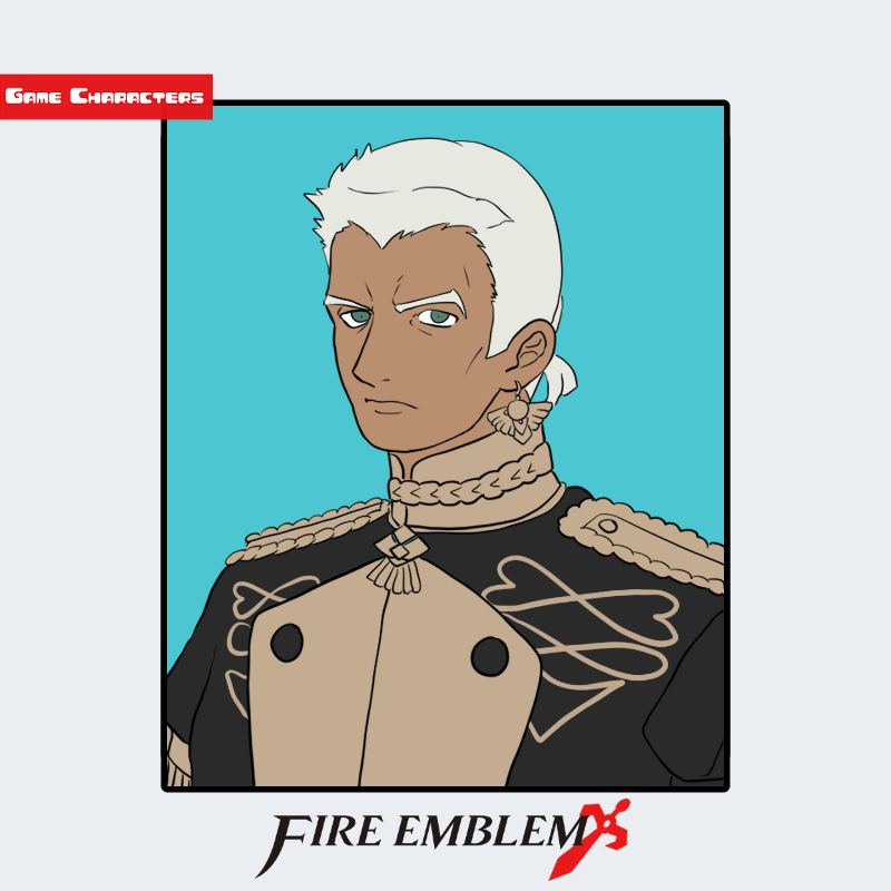 『ファイアーエムブレム 風花雪月』に登場するドゥドゥー=モリナロは、白髪の短髪と屈強な体格を特徴とする男性キャラクターである。衣装は黒と金を基調とした士官学校の制服で、肩章や襟元に施された刺繍が厳密な左右対称構造を形成している。金の縁取りと房飾りを持つ高襟構造は、同作の王国所属キャラクターに共通する意匠であり、「軍装儀礼融合型構造」に分類される。全体的に装飾性を保ちながらも機能的な裁断がなされており、指揮官階層に準じた造形が確認できる。