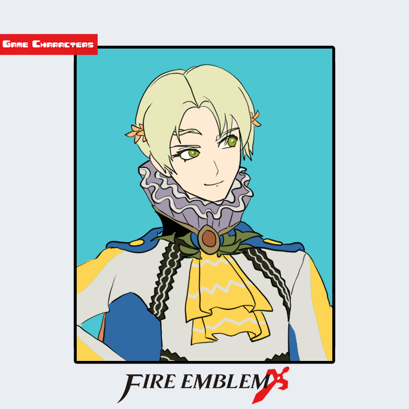 『ファイアーエムブレム エンゲージ』に登場するアルフレッドは、明るい金髪と淡い緑の瞳を持つ青年であり、上品な印象を与える襟元の高い衣装が特徴的である。首元にはフリル状の装飾を重ね、胸部には花をモチーフにしたブローチを留めている。衣装全体は白・黄色・青を基調とし、肩部の装甲風デザインが軽装貴族型の構造を示す。視覚的には「貴族戦装型」に分類され、騎士的要素と宮廷衣装の融合が確認できる。