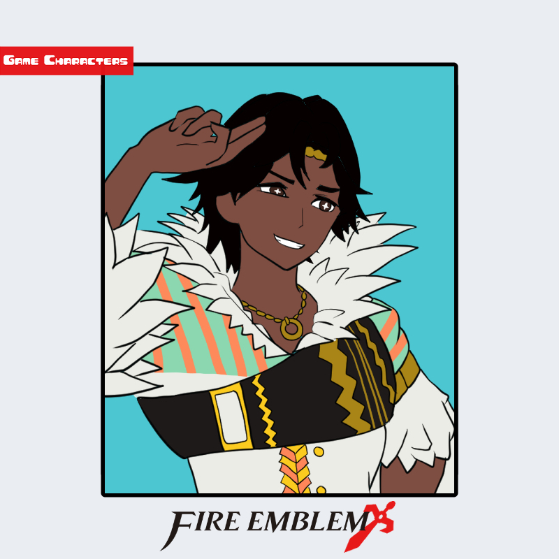 『ファイアーエムブレム エンゲージ』に登場するフォガートは、短く整えた黒髪と褐色の肌を持つ男性キャラクターである。衣装は黒と金を基調とし、首元と肩部に白い毛皮装飾が施されている。胸元には幾何学模様を描いた布地が重なり、全体として民族的な装飾構造を持つのが特徴。腕部や襟元のデザインから、軽装でありながら儀礼的要素を併せ持つことがうかがえる。構造的には「遊撃王族型」に分類され、華やかさと実戦性を両立した設計が見られる。