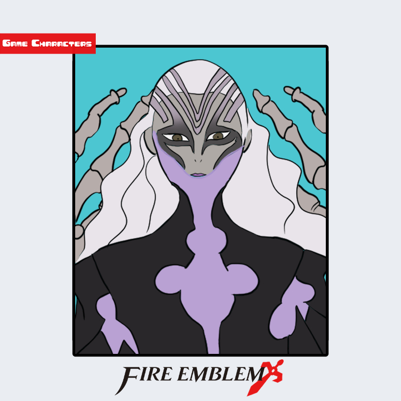 『ファイアーエムブレム ヒーローズ』に登場するヘルは、全体に冷たさを感じさせる紫と黒の配色を基調としたキャラクターである。髪は長く白銀色で、額から後頭部にかけて角状の装飾を持つ頭部デザインが特徴的。肌や衣装の一部には淡紫色の文様が走り、人体と装飾が一体化したような「融合装甲型」の構造を示す。露出を抑えた衣装構成ながらも、曲線的なラインで身体の形状を強調しており、死や静寂を象徴する視覚構成が強い。同作の他の神格存在と比べても、装飾と肉体の境界が曖昧で、異界的な印象を与える。