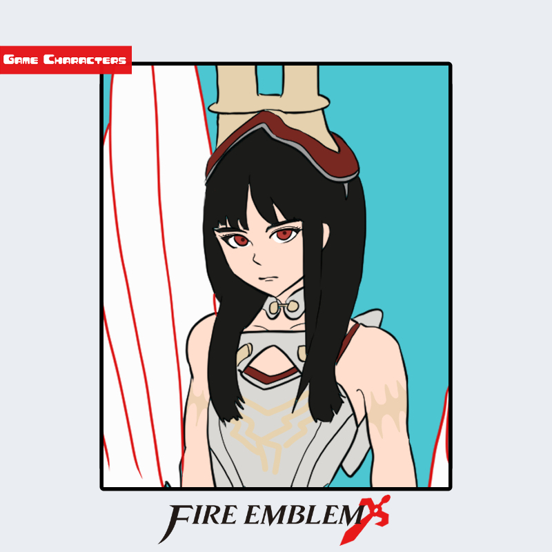 『ファイアーエムブレム ヒーローズ』に登場するフレスベルグは、白を基調とした神聖的な衣装構成を持ち、全体に滑らかなシルエットでまとめられている。黒髪のロングストレートが印象的で、額から伸びる冠状の装飾が上位存在としての地位を象徴する。肩から胸部にかけては白布と金色の装飾が交差し、上半身を覆う「儀礼鎧型」構造を形成。露出の少ない設計ながらも、赤い瞳や髪とのコントラストが強く、視覚的焦点を明確にしている。同作品内のヘルとは対照的に、生と秩序を象徴する構造配置が見られる。