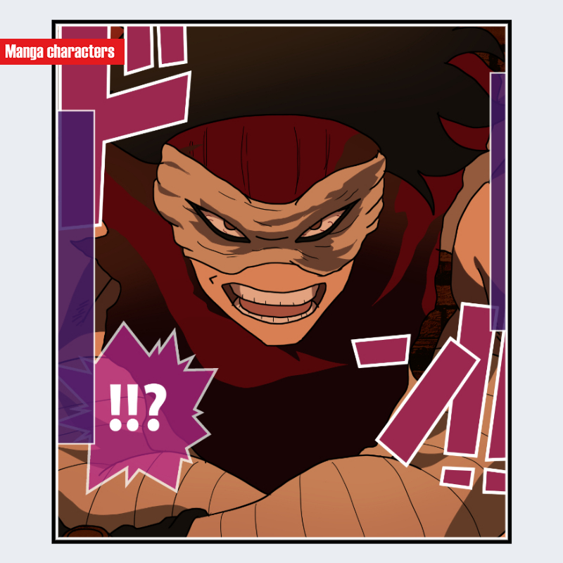 『僕のヒーローアカデミア』に登場するステインは、額から鼻梁にかけて赤い帯状の布を巻いた特徴的な頭部シルエットを持つ。目は細く鋭く、上下に深い影線が入ることで眼窩の陰影が強調されている。口元は大きく露出し、歯列が見える開口構造が描かれており、頬から顎にかけての線は切り込みのように鋭い角度で区切られている。衣装は暗赤・黒系を基調とし、肩から胸にかけて厚みのある布パーツが層状に重なる「装具融合型」に分類される。同作内でも布帯+露出した下顔面という構造が特に識別点となる。