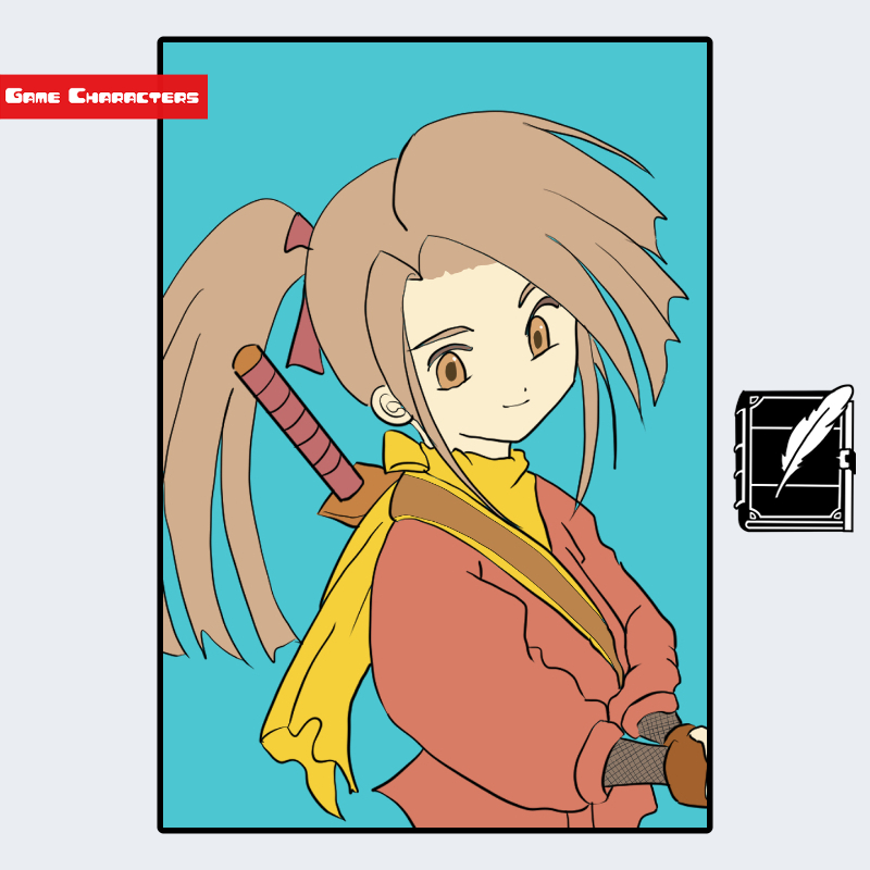 『テイルズ オブ ファンタジア』に登場する藤林すずは、茶系の長髪を高めの位置で束ね、後方に大きく流した髪型を特徴とするキャラクターである。衣装は赤茶色の軽装に黄色の帯を組み合わせ、背中には刀の鞘が装着されている。全体的に和装の意匠を取り入れつつも、動きやすさを重視した構成で、忍装束的な機能美が見られる。肩や胸元の裁ち線はシンプルにまとめられており、同作の重装系キャラであるクレスとは対照的な「軽装戦闘衣融合型」のデザインに分類される。
