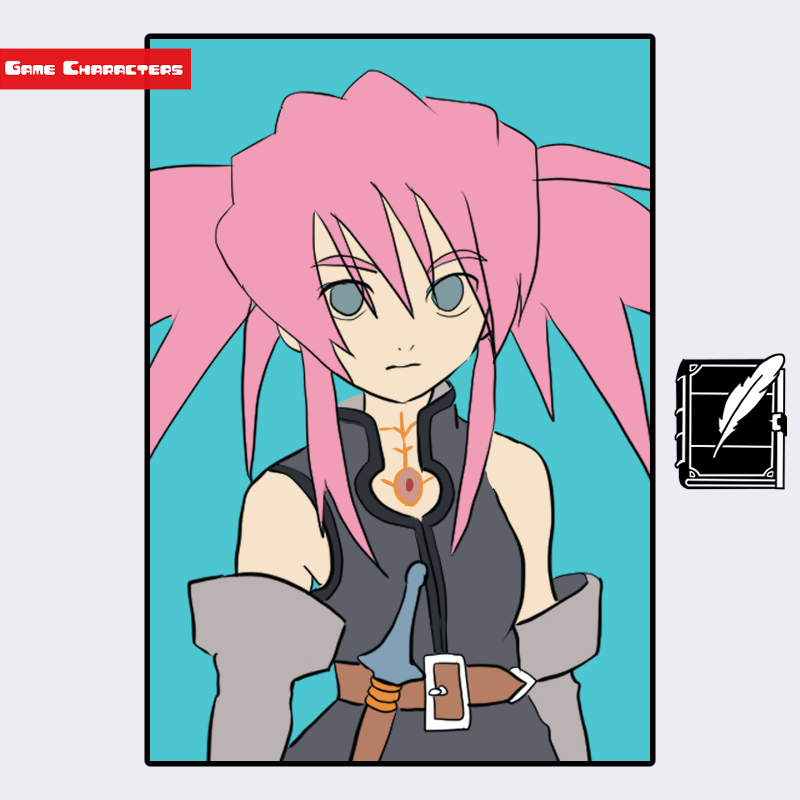 『テイルズ オブ シンフォニア』に登場するプレセア・コンバティールは、明るいピンク色の髪を左右に大きく結んだ特徴的なツインテールが印象的なキャラクターである。衣装は灰色を基調としたベスト型の上着に、胸元の金属的装飾と首元の紋様が配置された構造を持つ。肩と腕の露出があるため可動性が高く、全体として「機械融合型」のデザインに分類される。造形は同作のコレット・ブルーネルの軽装聖衣構造とは対照的に、重厚さと機能性を併せ持つ設計となっている。