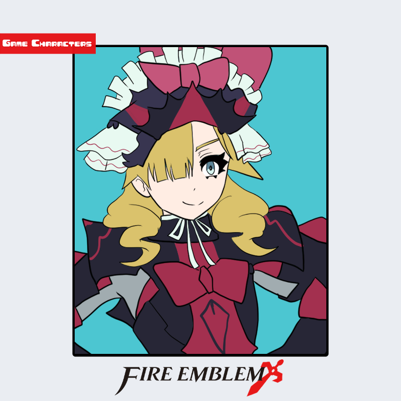『ファイアーエムブレム エンゲージ』に登場するマロンは、金髪のツインテールと大きなヘッドドレスを特徴とする女性キャラクターである。髪は左右で外向きに巻かれたカール構造を持ち、頭部にはリボンとフリルを組み合わせた帽子状の装飾が確認できる。衣装は黒と赤を基調とし、襟元や袖口にゴシック調のフリル装飾が施されている。全体として舞台衣装的な対称デザインを持ち、構造分類としては「装飾演出融合型」に該当する。