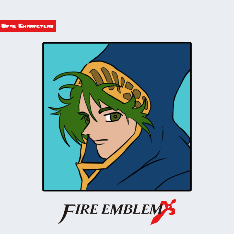 『ファイアーエムブレム』シリーズに登場するマリクは、緑色の髪と青いローブを特徴とする男性キャラクターである。髪は短く前方に流れるように整えられ、額部分から外へ広がる自然な束感を持つ。頭部には金の装飾が施されたフードを被っており、内側の縁取りが衣装全体と統一された色構成を示している。衣装は魔道士系の装束として典型的な長衣型で、肩から胸元にかけての縁取りが印象的な造形となっている。構造分類としては「魔道士装束融合型」に該当する。