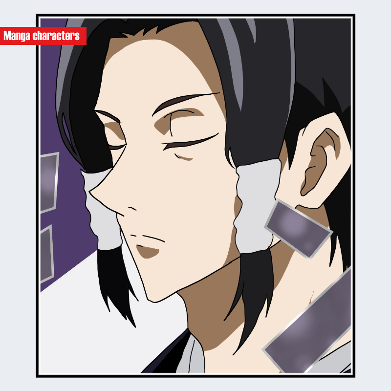 『呪術廻戦』に登場する加茂憲紀は、長めの黒髪を左右へ流した直線的な髪型を持ち、側頭部には白い紙片状のパーツが複数貼り付けられた構造が視認できます。顔立ちは細い輪郭線で整えられ、眉は長く下向きに描かれ、表情は抑制された静的配置です。衣装は視認範囲では首元から上のみで、濃色の衣装らしき領域がわずかに見える程度であり、装飾は紙片以外には確認されません。紙片パーツが明確に外部装飾として付加されている点は、同作品内の他キャラの通常の素体構造との差異として特徴的です。分類上は、素体+外付け装飾型の構造に属します。