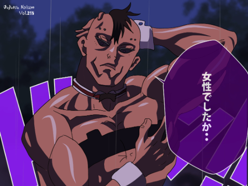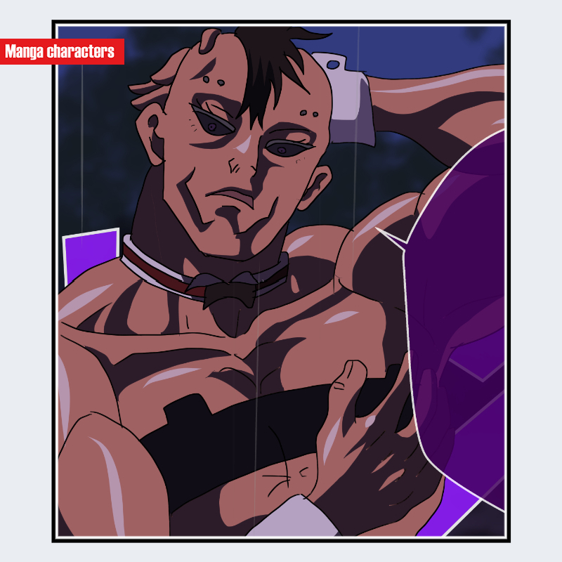 『呪術廻戦』に登場する壊相は、上半身に強調された筋肉構造を持ち、皮膚表面には黒い線状パターンが複数走る異形系素体デザインで構成されています。頭部は左右非対称な削れたような質感を持ち、目の周囲の窪みが深く描かれた骨格強調型の造形です。首元には黒色の紐状パーツが巻かれ、衣装というより外付け装飾に近い扱いで配置されています。体表の陰影処理が濃く、素体自体がデザインの中心となる構造で、同作品内の人型キャラよりもクリーチャー寄りの階層に属します。