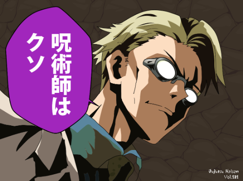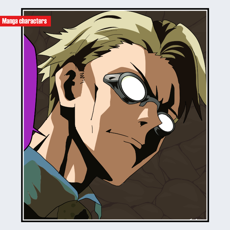 『呪術廻戦』に登場する七海建人は、明るいブロンド系の短髪を後方へ流す整髪構造を持ち、髪束は直線的で均一にまとめられています。最大の特徴は丸レンズのゴーグル型眼鏡で、側面には金属的な厚みを持つフレームが外付けされています。眼鏡によって目元の情報が大部分隠れるため、顔の下半分の輪郭が強調され、影のつき方も直線的です。襟元から上の視認範囲では淡い色味の上衣と思われる布地が確認でき、素体+外付けアイウェア構造に分類されます。同作品内の通常の眼鏡キャラとは異なり、特殊装備寄りのデザイン階層に属します。