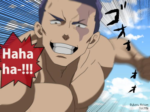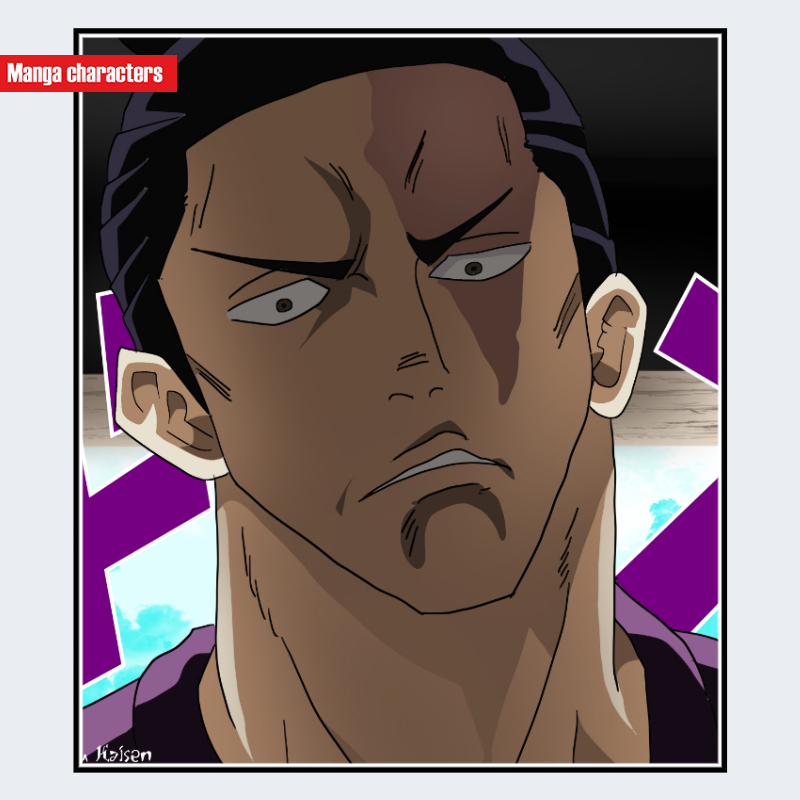『呪術廻戦』に登場する東堂葵は、極めて発達した上半身の筋肉構造を持つ大型素体キャラクターで、胸部から肩にかけての筋線が明確に強調されています。髪型は黒髪を後方にまとめた短髪寄りの構造で、額は大きく見える描かれ方となっています。顔立ちは輪郭が鋭く、特に顎から口元にかけての影が強い直線的処理で描かれています。視認範囲では衣装の大部分は確認できませんが、首周りには濃色の衣装布地が見られ、動きに合わせたシワが強調されています。同作品内の釘崎・伏黒らの標準制服キャラに比べ、筋肉表現が主役となる素体特化デザインに分類されます。