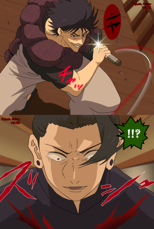 『呪術廻戦』に登場する伏黒甚爾は、黒髪を後方へ大きく流した長めの髪型で、前髪は束として左右に垂れる不規則な構造が見られます。目元は強い影で縁取られ、上まぶたの描線が太く、表情の鋭さを際立たせる視覚処理になっています。上半身は大きく発達した筋肉構造が強調され、肩部には丸みのある外付けパッド状の衣装パーツが確認できます。衣装は濃色で、身体の動きに合わせた皺が明確に描かれています。素体の筋肉量と衣装パーツの存在が同作品内の他キャラ(伏黒恵・乙骨など)と比較した際の大きな識別点です。