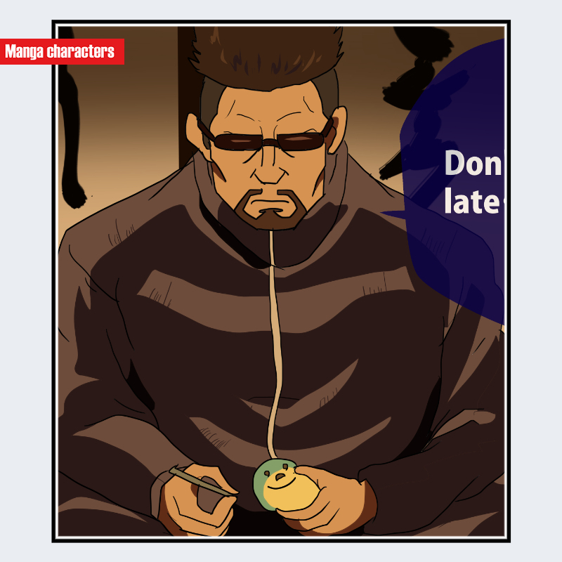 『呪術廻戦』に登場する夜蛾正道は、頭頂部から後方へ向かって短く整えられた黒髪を持ち、前髪は上方へ流れる直線的な短髪構造です。顔全体は太い輪郭線と落ち着いた陰影で描かれ、目元は角度のあるまぶた線が特徴的です。上半身は濃色の上衣で覆われ、首元にはジッパーの走る構造が確認できます。外付け装飾は見られず、素体+実用衣装の組み合わせで構成された日常寄りのデザイン階層です。同作品内の五条悟などの華やかな装飾系キャラと比較すると、夜蛾は無装飾・機能性重視の衣装構造に属します。