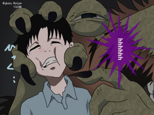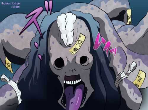 『呪術廻戦』に登場する呪霊(画像にある個体)は、複数の手足や顔面を思わせる形状が混在した合成的な異形素体構造を持ち、身体表面は不規則にねじれた肉塊や凹凸によって構成されています。頭部に相当する位置は不明瞭で、複数の口腔状パーツや眼のような窪みが散在し、明確な輪郭を持たない形態が視認できます。上半身に相当する部分には触手状の突起が多数伸び、外付け装飾ではなく素体そのものの変異として形成されています。人型や動物型の構造とは異なり、形態が一定せず、複数の部位が融合したような混成デザイン階層に分類されます。