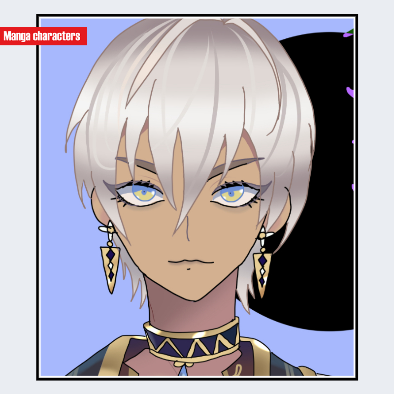 『にじさんじ』に登場するイブラヒムは、白系の短髪を基調としたレイヤー構造で、前髪は縦方向に細かく分割された束感の強い配置となっている。肌は褐色寄りのトーンで描かれ、瞳は淡い黄色を中心としたコントラストの強い配色である。耳元には左右対称に長い三角型の装飾イヤリングが下がり、金と黒の配色が衣装全体と連動した「装飾強調型」の構造を形成している。視認範囲は上半身に限定されており、服装は単色のトップスでシンプルな線構成が確認できる。同作内の他キャラと比較すると、褐色肌と幾何学装飾の組み合わせが大きな視覚差異を生み出している。