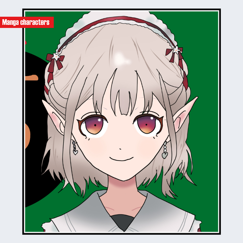 『にじさんじ』に登場するえるは、淡い灰色系のショートボブに近い髪型で、前髪は細かく区切られた束が中央に向けて流れる構造となっている。耳は大きく尖ったエルフ様式の形状で、可視範囲では「擬獣化構造」に分類される特徴的なシルエットを持つ。瞳は赤紫系の濃淡を重ねた配色で、外側に向けて明暗差が強調されている。耳元には左右対称の細長い装飾イヤリングが下がり、銀系の金属色と赤の差し色が視覚的アクセントとなっている。同作の他キャラと比較すると、尖耳と赤紫の瞳を組み合わせた外見構造が大きな差異として現れている。