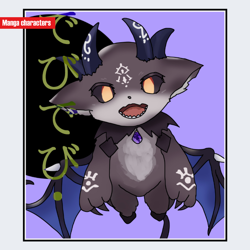 『にじさんじ』に登場するでびでび・でびるは、全身が獣的特徴を備えた小型の擬獣キャラクターで、頭部は黒を基調とした毛並みと大きな耳を持つ。目は橙色系の強い発光表現が施され、瞳孔が細い縦形で描かれている。胸元には淡い色の毛並みが広がり、首元には紫色の宝石を中心とした装飾が位置する。腕部と体側には白い文様が対称に描かれ、「擬獣化構造」と「文様強調型」の組み合わせが特徴である。同作内の他キャラと比較すると、人型ではなく獣型のシルエットが最も大きな差異となる。