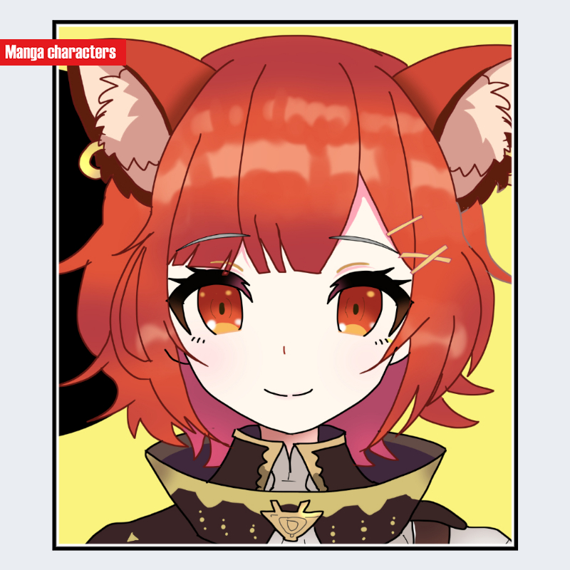 『にじさんじ』に登場するラトナ・プティは、赤寄りの橙系を基調としたショートボブに近い髪型で、外側へ広がる毛束と内側のレイヤーが組み合わさる構造を持つ。前髪は複数の束が左右へ分岐し、右側には細いヘアピンが確認できる。頭部には丸みのある獣耳が配置され、毛色は髪色よりやや淡いブラウンで「擬獣化構造」に分類される特徴が明確である。瞳は橙色から赤へのグラデーションが入り、外周の描線が強めに設定されている。同作内キャラとの比較では、獣耳と暖色系髪色の組み合わせが大きな視覚差異となっている。