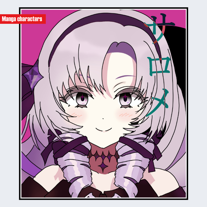 『にじさんじ』に登場する壱百満天原サロメは、淡い紫を基調とした長髪で、前髪は中央で縦に割れつつ複数の束が規則的に並ぶ構造を持つ。髪全体は外側へふんわりと広がり、毛先に緩いカールが入った「多層ウェーブ型」のシルエットとなっている。瞳は紫系で、内側から外側へ段階的な明暗差が付けられている。衣装は襟元にフリル状の装飾が重なり、肩周りには濃紫のリボン型パーツが確認できる「装飾集約型」の視覚構造である。同作内キャラと比較すると、紫色の統一配色とフリルの多層構造が大きな外見的差異を形成している。