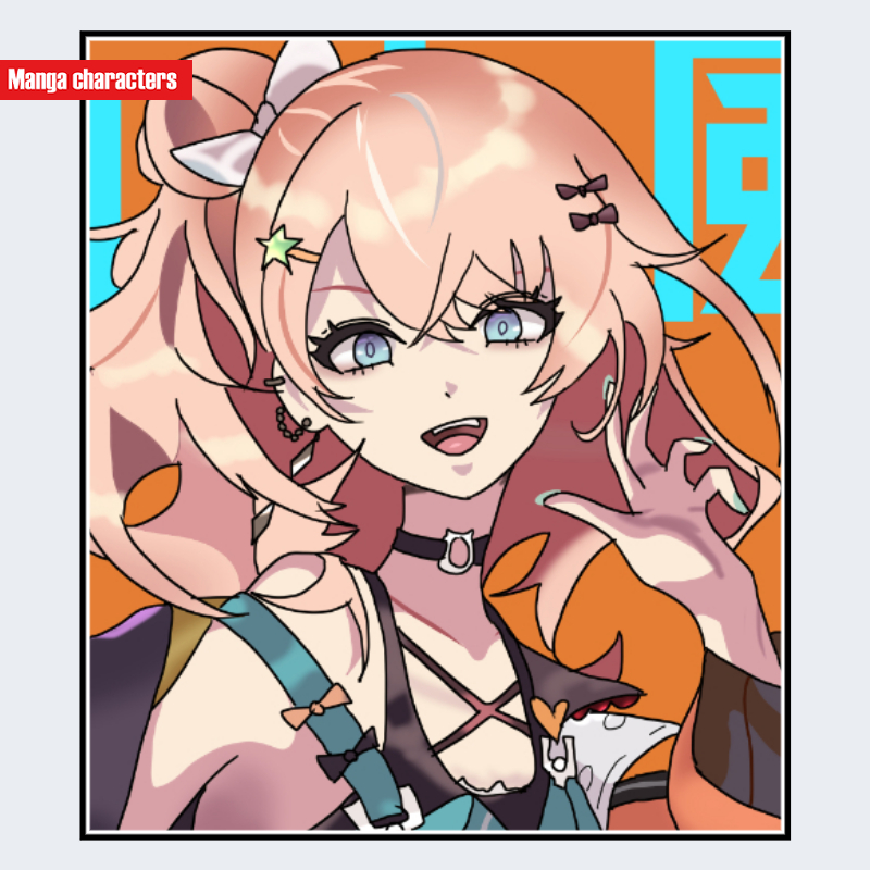 『にじさんじ』に登場する五十嵐梨花は、淡いピンク寄りのオレンジ系を基調としたボリュームのあるロングヘアで、外側へ大きく広がる束と内側の細かなレイヤーが重なる多層構造を持つ。前髪は複数の束が鋭角に分岐し、左右で長さの異なる非対称配置となっている。頭部の近くには大きめの飾りリボンが確認でき、「アクセサリー融合型」の要素が明確である。瞳は青系で外周に強い線が入り、虹彩の内側にハイライトが重なる描画構造を持つ。同作内キャラとの比較では、髪量の多さと明るい暖色髪色、リボン装飾の組み合わせが大きな視覚的差異を形成している。
