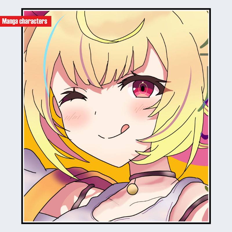 金髪は英語で “blonde hair” と簡略化されやすいが、淡色寄りの黄色系であるため “light blonde hair” と補足すると正確さが増す。ピンク系の瞳は “pink eyes” と単純化されがちで、実際の濃淡構造を伝えるため “pink gradient eyes” と記述することが望ましい。前髪の非対称束構造は “asymmetrical segmented bangs” と補足することで誤認を防げる。