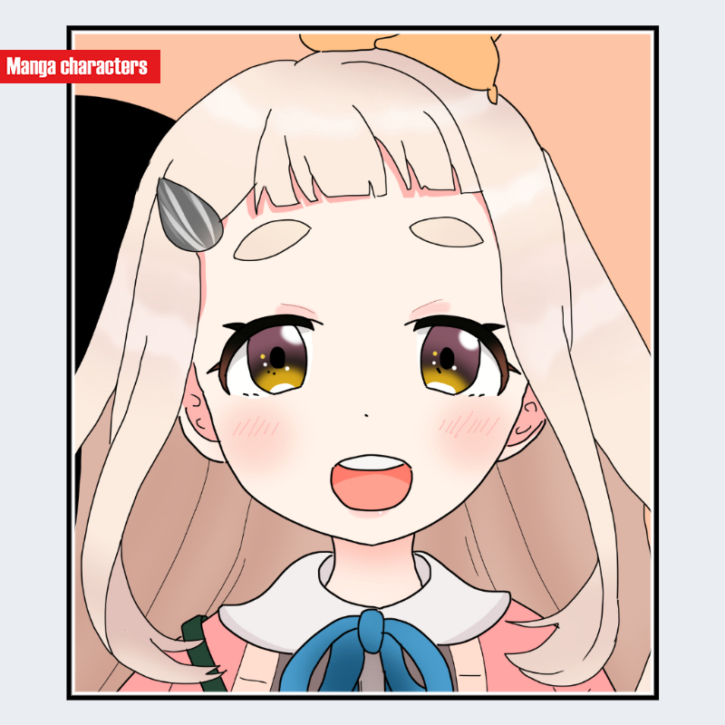 『にじさんじ』に登場する町田ちまは、淡いクリームベージュ系のロングヘアを基調とし、毛先が柔らかく内側へ丸まる「内巻きレイヤー型」の髪構造を持つ。前髪は短い束が均等に並び、額に沿って水平気味に配置されている。左右のこめかみ付近には楕円形の淡色ヘアアクセサリーが確認でき、「アクセサリー装備型」の視覚要素が明確である。瞳は黄寄りのブラウン系で、虹彩の中心部に強めのハイライトが描かれ、柔らかい陰影が付けられている。視認範囲では白系の衣装が見え、髪色との穏やかな色調バランスを形成している。
