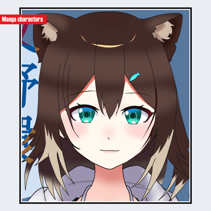 『にじさんじ』に登場する文野環は、濃いブラウン系のショートボブ寄りの髪型で、外側へ緩やかに広がる毛束と内側の短いレイヤーが組み合わさる構造を持つ。前髪は複数束が不規則に分岐し、額に沿って自然に垂れる配置である。右側には小型の青系ヘアピンが装着され、「アクセサリー装備型」の視覚要素が確認できる。瞳は青と緑の中間に位置する淡いエメラルド系で、虹彩外周に細い描線が入り、中心に向かって柔らかな明暗差が描かれている。視認範囲では白系の衣装が見られ、髪色との対比が穏やかに調整されている。