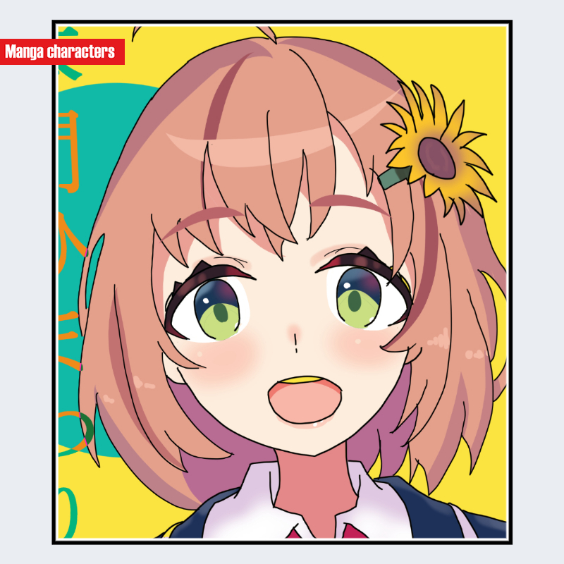 『にじさんじ』に登場する本間ひまわりは、淡いピンクがかったオレンジ系のショートボブで、外側へ柔らかく広がる束と内側の短いレイヤーが組み合わさる「ショートレイヤー型」の髪構造を持つ。前髪は複数束が不規則に分岐し、中央の束がやや長めに垂れる配置である。頭部左側には大きなひまわりの髪飾りが付けられ、「アクセサリー装備型」の視覚要素が明確である。瞳は緑と青の中間色に近い彩色で、虹彩外周に濃い線が入り、中心へ向けて柔らかな明暗差が描かれている。視認範囲では明るい色調の衣装が確認でき、髪色と自然な調和を形成している。