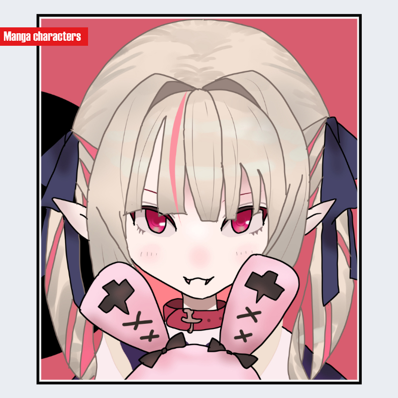 『にじさんじ』に登場する魔界ノりりむは、淡いベージュ寄りの金髪を基調としたツインテール構造で、外側へ向けてふんわり広がる束と内側の短いレイヤーが重なる「ツインテール層状型」の髪構造を持つ。前髪は短い束が等間隔で揃えられ、額に沿って整然と配置されている。両側の頭部には黒と赤のリボンが結ばれ、「アクセサリー装備型」の特徴が明確である。耳は細長く尖った形状で、「擬獣化構造」に近い外見的要素を示す。瞳は赤紫系で外周の描線が濃く、中心に向けて段階的な明暗差が描かれている。