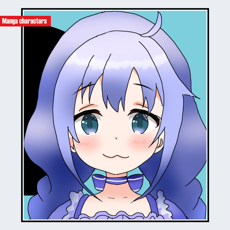 青紫寄りの髪色は “lavender-blue hair” と記述すると単純な “blue hair” との区別がつきやすい。大きく外側へ広がるカールは “outward curled side hair” と補足しないと内巻きと誤読される可能性がある。淡い青系の瞳は “pale blue eyes” と表現できるが、グラデーション構造を伝えるためには “pale blue gradient eyes” が適切である。