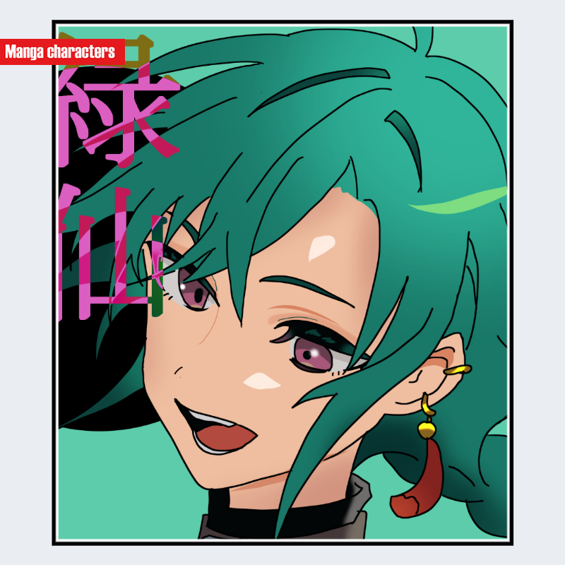 『にじさんじ』に登場する緑仙は、鮮やかなエメラルドグリーン系のショート寄りロングヘアで、外側へ流れる束と内側の細いレイヤーが重なる「流線ロング型」の髪構造を持つ。前髪は不規則な細い束が額に向けて落ち、左右非対称の鋭いラインを形成している。耳には複数のゴールド系ピアスが装着され、「アクセサリー装備型」の視認要素が明確である。瞳は紫寄りの赤紫系で、外周に強い描線が入り、中心へ向けて明暗差が段階的に描かれている。視認範囲では黒系の衣装が確認でき、髪色とのコントラストが強く設定されている。