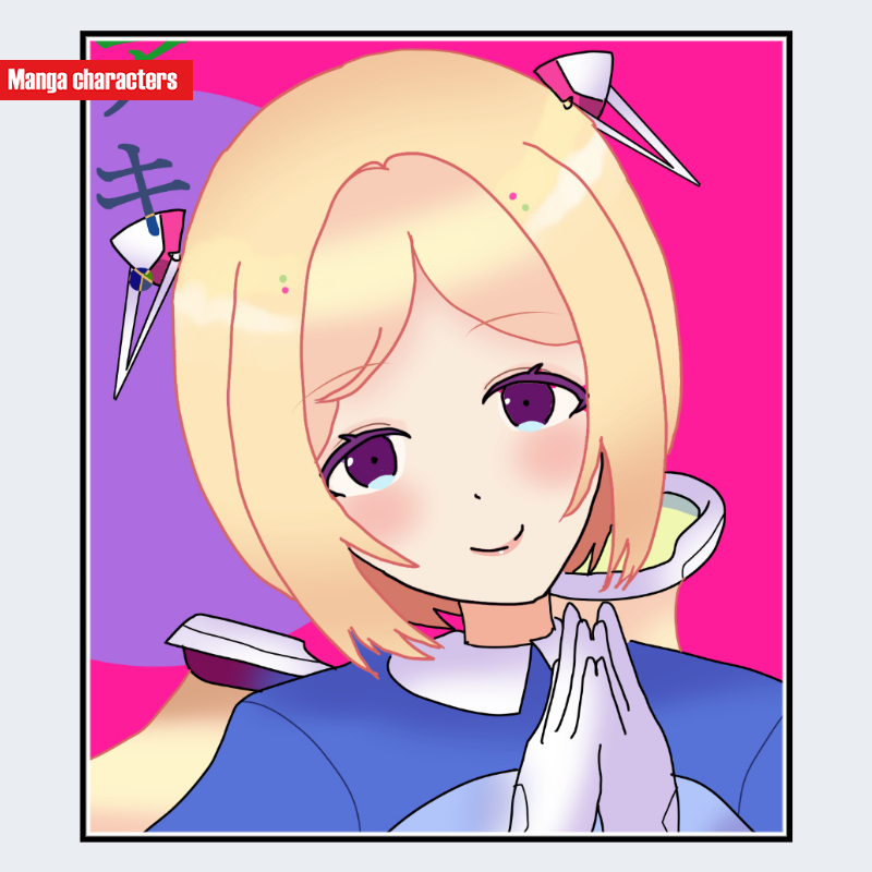 『ホロライブ』に登場するアキ・ローゼンタールは、明るいブロンド寄りのショートボブで、毛先に向けて緩やかな内巻きを形成する「ショートボブ層状型」の髪構造を持つ。前髪は中央付近で弧を描くように流れ、束の分割が少なく丸みを帯びた印象を与える配置である。瞳は紫系で、外周に濃いラインと淡いハイライトが入り、虹彩内の色差が控えめな均質構造となっている。視認範囲の衣装は青と白を基調とし、首元に特徴的な装飾パーツが確認でき、髪色との明確なコントラストが構成されている。