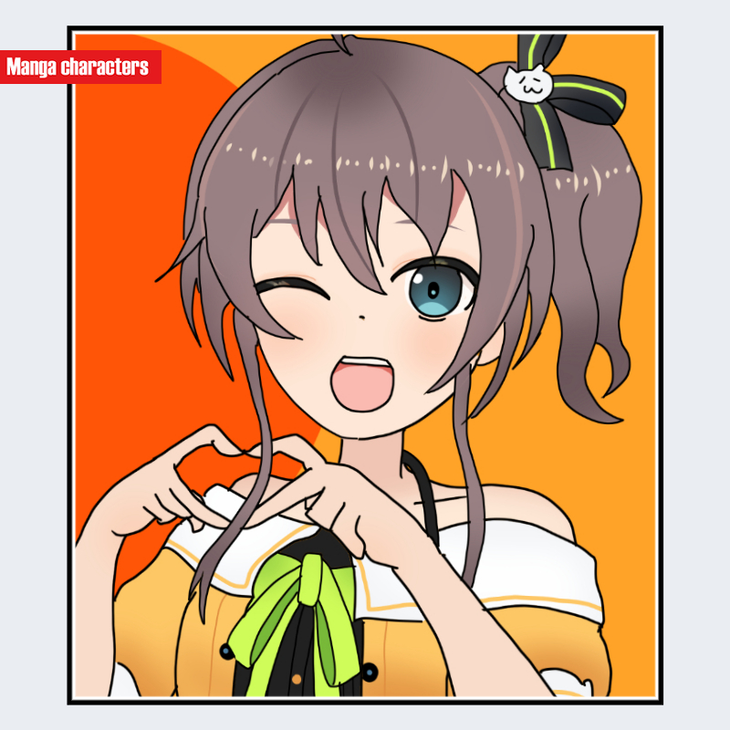 『ホロライブ』に登場する夏色まつりは、ツインテール状にまとめた明るいブラウンの髪と、片目を閉じたウインク表情が視認上の大きな特徴である。前髪は不規則に流れ、毛束が左右に軽く跳ねる構造を持つ。衣装は白系トップスに黄緑色の装飾が差し込まれ、肩口が開いた軽装型のデザインで、上半身の可視範囲ではリボン状意匠が確認できる。手元は指でハート形を作るポーズを取り、動きのあるジェスチャーが前景化している。全体として「軽装アイドル型」の構造分類に位置づけられ、同グループ内の重装・和装系キャラとの衣装階層の差が明確である。
