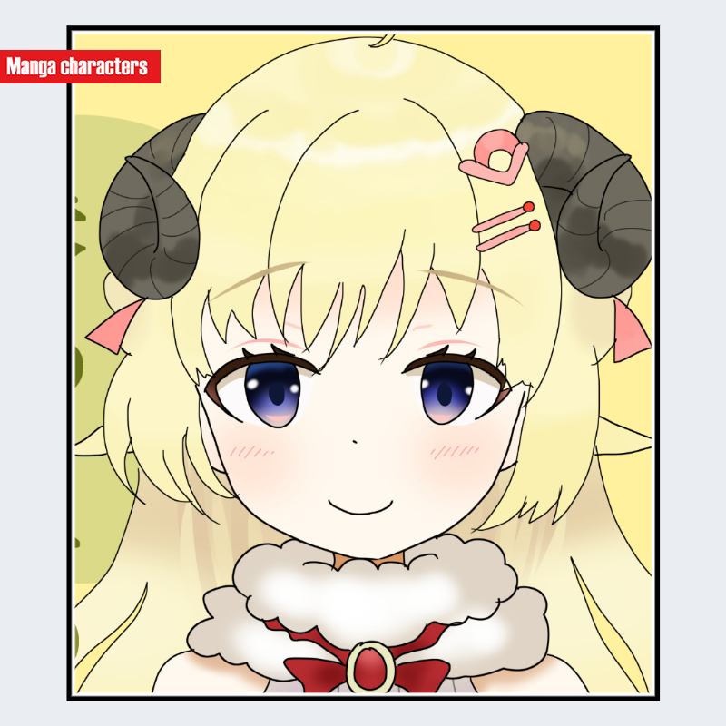 『ホロライブ』に登場する角巻わためは、明るいブロンドの長髪を基調とし、側頭部に湾曲した黒系の角を備える点が最も特徴的である。前髪は細かく分かれた短い束が眉上で整えられ、左右にはピンク系の小型飾りが差し込まれている。頬には淡い紅潮表現があり、衣装は上半身のみ可視で白系の柔らかい素材を基調とした軽装構造である。全体として「擬獣化構造」に該当し、同作内の角・耳など動物的要素を持たないキャラとの視覚階層差が明瞭である。