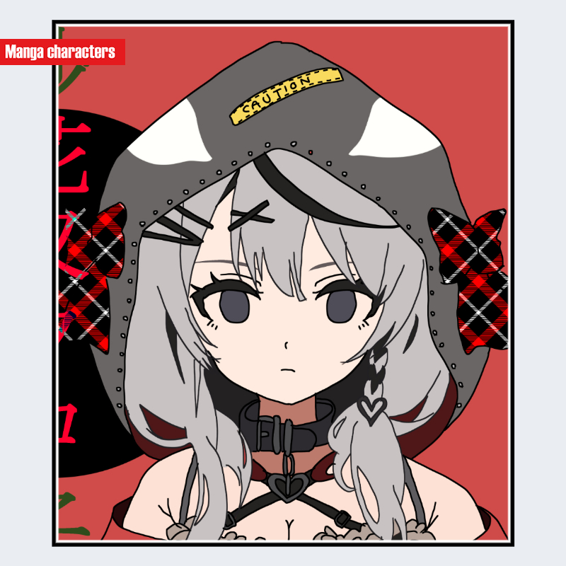『ホロライブ』に登場する沙花叉クロヱは、灰色系のセミロングヘアを基調とし、前髪に複数の黒いヘアピンを重ねて配置した点が特有の視覚要素となっている。頭部には黒基調のフード型パーツがあり、耳状の突起と赤黒チェック柄の装飾が左右に配置される構造を取る。上半身は黒系衣装で、首元には紐状の結び目とハート型の金属風チャームが確認できる。全体として「フード装備型」に分類され、角や耳など動物的外形要素を持つキャラとは異なり、衣装パーツによる輪郭強調が中心の構造となる。