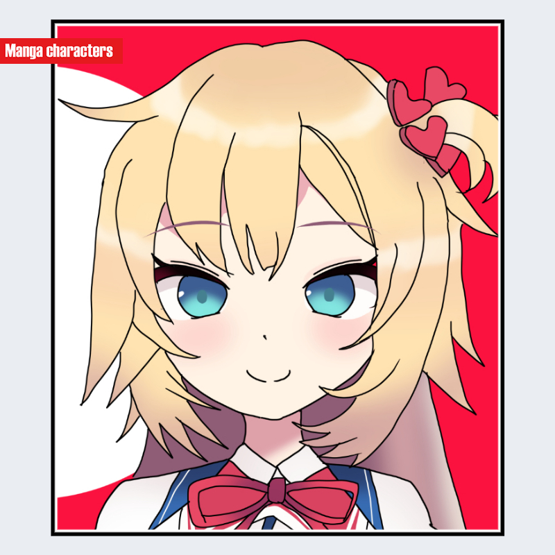 他作品のブロンド少女キャラと混同されやすいが、右側の赤リボンと外向きボブシルエットの組み合わせが識別点となる。