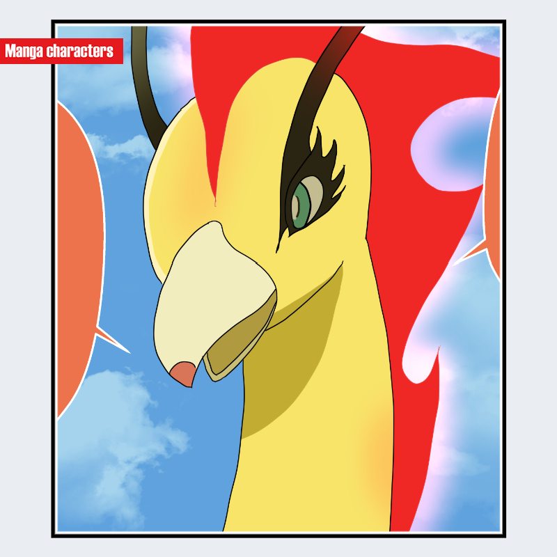 『銀魂』に登場するオロチン は、鳥類を思わせる黄色を基調とした頭部と、前方へ大きく張り出した嘴状パーツを備える外形構造を持つ。額から頭頂部にかけては赤い炎状の突起が連なり、黄色との強いコントラストでシルエットを形成している。目は縦長の黒目がちで、睫毛の強調によって視線方向が明確に示される。上半身はほとんど露出していないが、首元には青空を背景にした外界が確認でき、構造的には「擬獣化構造(鳥型)」に分類される。他キャラの人型・マスコット型と異なり、嘴と炎状突起が主たる識別要素となる。