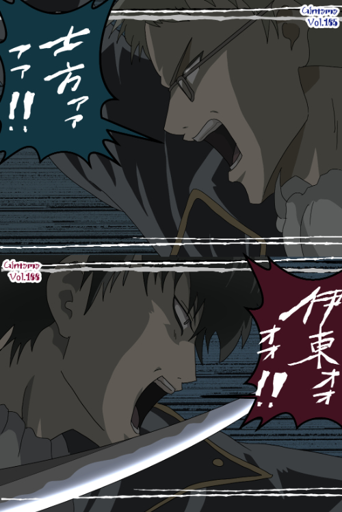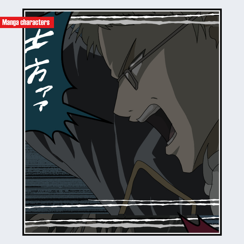 『銀魂』に登場する伊東鴨太郎 は、金髪寄りの明るい色調の髪を持ち、前髪は鋭く分岐しつつ側頭部へ流れる構造となっている。可視範囲では顔の側面が強い陰影で描かれ、口元は大きく開いており輪郭線が顕著に強調されている。上半身は黒を基調とした衣装で、襟元に白系のラインが入る構造が確認できる。全体として「人型(制服融合型)」に分類され、擬獣化パーツや仮面パーツを持つキャラとは異なり、人型の輪郭・衣装の直線配置が主要な識別点となる。