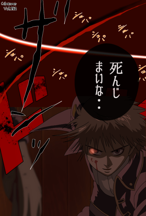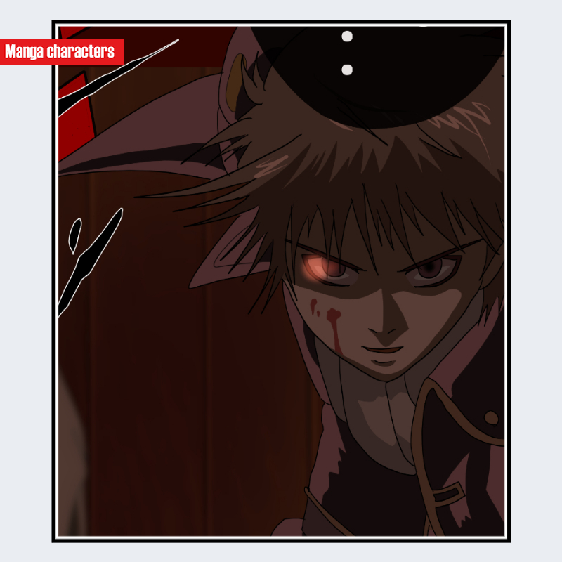 『銀魂』に登場する沖田総悟 は、明るい茶系の短髪を基調とし、頭頂から外側へ向かって鋭く広がる束状のヘアシルエットが特徴である。顔の可視範囲では、右側から強い陰影が差し込み、片目が赤く輝く表現が描線上のアクセントとして確認できる。制服は黒を基調に金の縁取りが施され、襟元から肩にかけて直線的なラインが並ぶ典型的な「制服融合型」構造である。頬には血の付着が描かれており、これは作画上の視覚要素であり設定説明には含めない。全体として、人型シルエットと鋭角束髪が識別の中心となる。