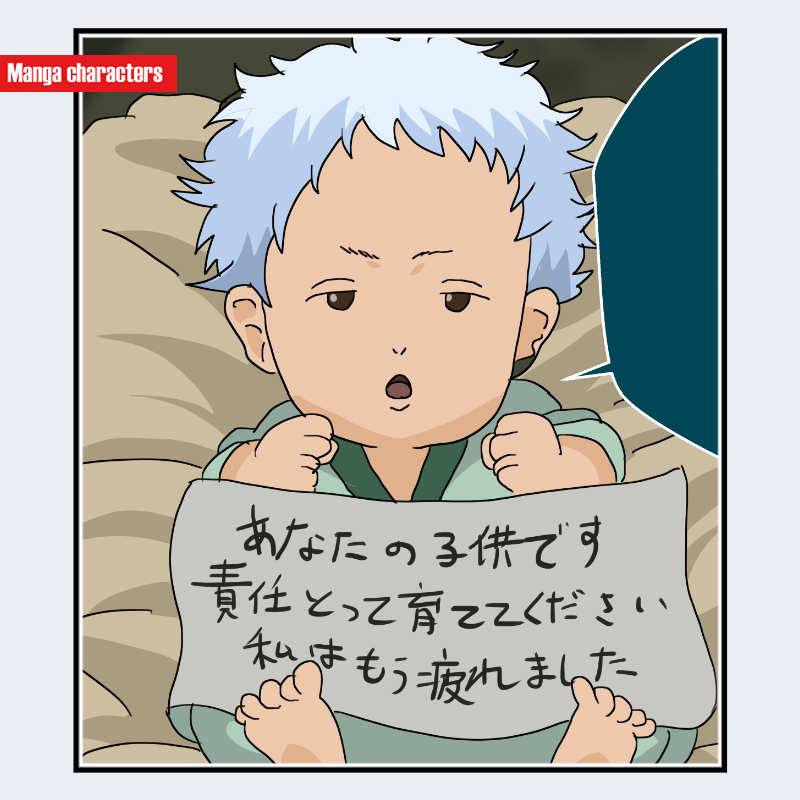 『銀魂』に登場する勘七郎(かんしちろう)は、淡い青みを帯びた短髪を基調とした幼児的な外形を持ち、髪は頭頂部からランダムに跳ねるような束構造で描かれている。目は細く半開きで、口元は小さな円形に近い形で強調されている。上半身は薄緑の衣服が可視範囲に見られ、体格は丸みを帯びた幼児型シルエットとなっている。前景には紙片を持つ手が描かれており、手指は幼児特有の短く丸い形状で示されている。構造分類としては「幼児型(人型変形)」に該当し、成人キャラの鋭角的描線とは異なる柔和なラインが識別要素となる。