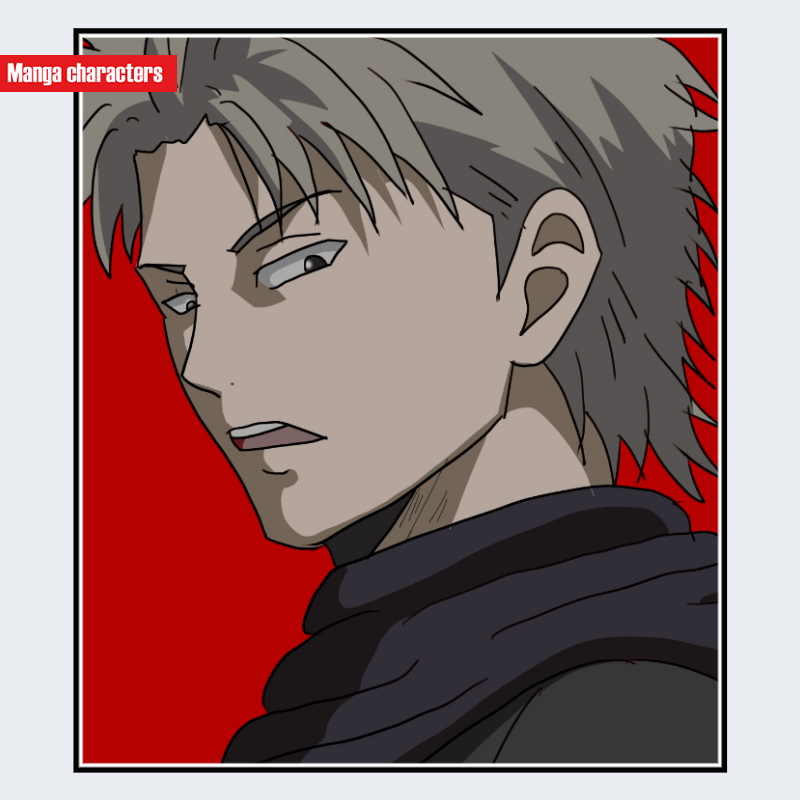『銀魂』に登場する阿伏兎(あぶと)は、灰色寄りの短髪を基調とし、後頭部へ向けて束が鋭く寝かされるように流れるヘアシルエットを持つ。側頭部から顎にかけては緩やかな影が入り、顔の輪郭線が硬質に強調されている。目は細く鋭い描線で描かれ、視線の方向に合わせて眉ラインがわずかに跳ね上がる構造となっている。上半身は暗色の衣装で、首元に沿って立ち上がる襟パーツが確認できる。全体として「人型(制服融合型)」に分類され、装飾パーツを持たず、髪型と輪郭の直線的造形が外形識別の中心となる。