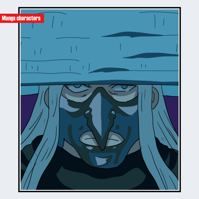 『銀魂』に登場する虚(うつろ)は、全身が青灰色の肌色で描かれ、細い目元と極端に長い鼻梁が外形の中心的特徴となっている。頭部は白系の長髪で覆われ、その上から大きな笠のような帽子が深く被せられ、顔の上部を影で覆う構図が取られている。頬から顎にかけては直線的かつ硬質な描線が用いられ、全体として冷ややかな印象のシルエットが形成されている。可視範囲の衣装も暗色系で統一され、肌色とのコントラストが際立つ。構造分類としては「異形型(長鼻構造)」に該当し、人型でありながら非日常的な顔パーツの比率が識別要素となる。