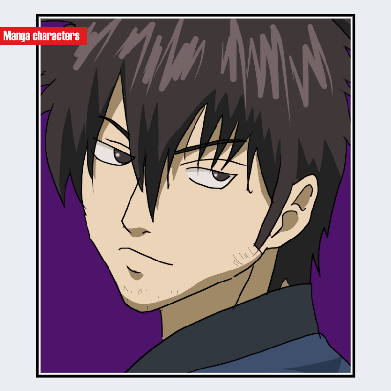 『銀魂』に登場する寺田辰五郎 は、暗い茶系の短髪を基調とし、前髪の束が額に鋭く落ちる非対称構造を持つ。目元は細く切れ込み気味の描線で、視線方向に合わせて眉の角度も強調されている。顎まわりには薄く無精ひげが描かれ、輪郭線に粗さを加えるような表現が確認できる。上半身は暗色の衣装で、襟元の生地の厚みが直線的に処理されている。全体として「人型(制服融合型)」に分類され、髪の束構造・細い目元・薄いひげの三要素が主な識別点となる。